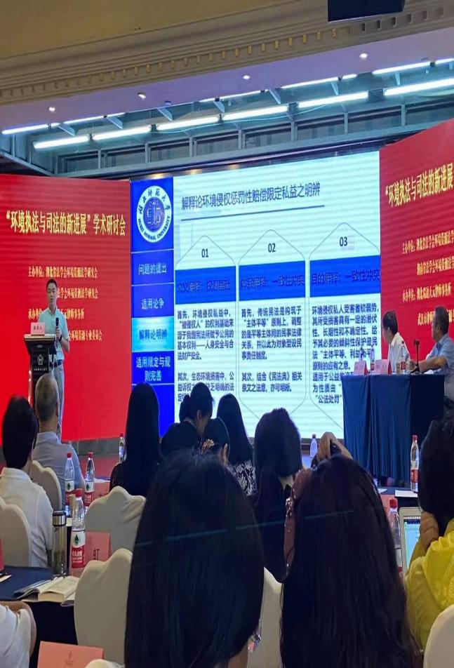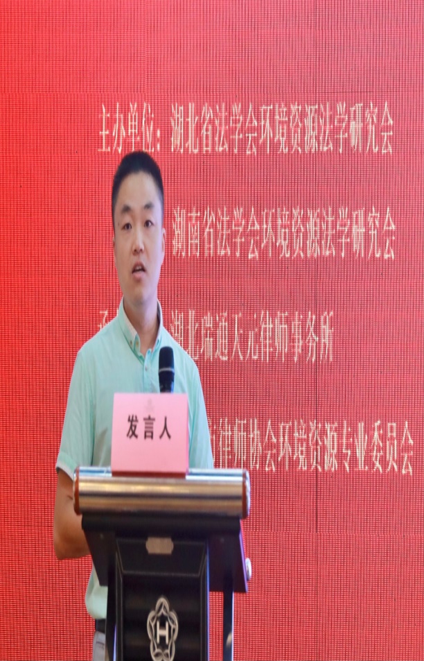 我院周勇飞博士作为湖北省法学会环境资源法学研究会副秘书长,全程组织参与首届联合年会的筹备工作,并在“环境执法与环境司法的新发展”环境围绕《环境侵权惩罚性赔偿的适用限制》作了主题报告。周勇飞博士针对《民法典》“侵权责任编”第1232条关于惩罚性赔偿适用范围的论争分别从文义解释、体系解释、目的解释三个层面就该条款应仅限于环境侵权私益救济进行阐释和分析,并提出在明晰其适用范围基础上,应在主观构成要件、结果要件、主观过错的证明责任、赔偿标准和计算方法等具体适用规则上进一步明确和细化。