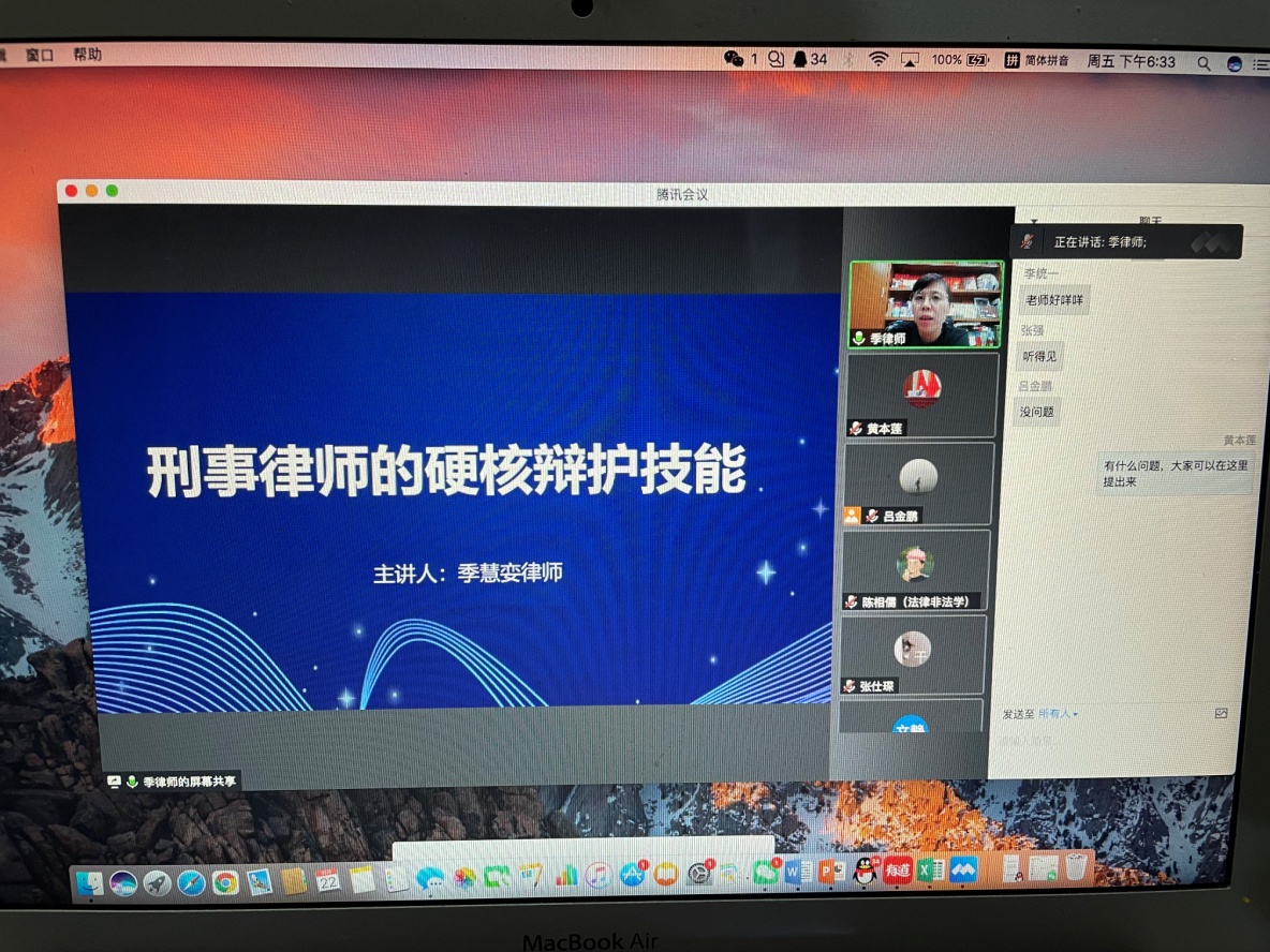 1022日晚630分至820分,浙江大公律师事务所合伙人老师季慧娈通过线上腾讯会议的形式,以“刑事律师硬核辩护技能”为主题向我院20级、21级法律硕士研究生开展刑事法律实务讲座。