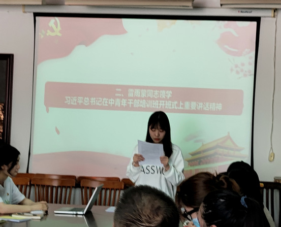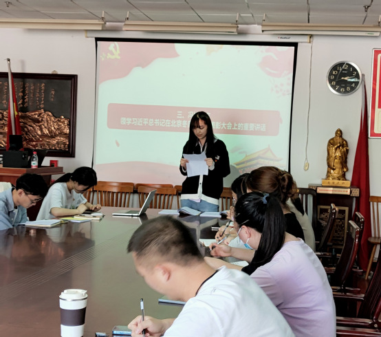 本次主题党日活动共有五个议题。一是按月缴交党费相关事宜。二是李处同志对本次党日活动的主题进行了介绍,并带领全体党员同志重温入党誓词。三是集体诵读《中国共产党章程》第三十二条相关内容。四是领学微党课。李思蓉同志领学了《习近平总书记2022年全国两会重要讲话精神》,向各位党员同志传达了习近平总书记首次提出的“五个必由之路”的重大论断以及关于我国发展仍具有的“五个有利条件”。雷雨蒙同志、冯婷同志、李旭峰同志、柯晨曦同志分别领学《习近平总书记在中青年干部培训班开班式上重要讲话精神》、《习近平总书记在北京冬奥会、冬残奥会总结表彰大会上的重要讲话》、《在中央政协工作会议暨庆祝中国人民政治协商会议成立70周年大会上的讲话》、《坚持把解决好“三农”问题作为全党工作重中之重,举全党全社会之力推动乡村振兴》让到会同志对新形势下的热点问题有了初步的了解,在现阶段不仅要专注于学习还要积极参加各项活动,实践就是练就过硬本领的过程,也是在树立理想信念的过程。五是围绕本次主题党日活动有关内容,党员代表李莹同志、吴佩倩同志结合自身的实际情况发表了心得体会,两位同志谈到在学习生活中要志存高远、勤学善为,踔厉奋发,笃行不殆,充分发挥党员的先锋模范带头作用,以实际行动迎接党的二十大胜利召开。