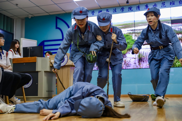 班级展示环节中,班长徐鸿财从清廉班级建设基础、班务公开、已开展活动以及建设计划等四个方面汇报了清廉班级建基本情况。随后,班级通过知识竞答、课本剧《金色的鱼钩》表演、学唱清廉歌曲《一路清风》、学习心得分享等形式开展清廉文化学习宣传教育,同学们参与积极、体会深刻、收获满满。
