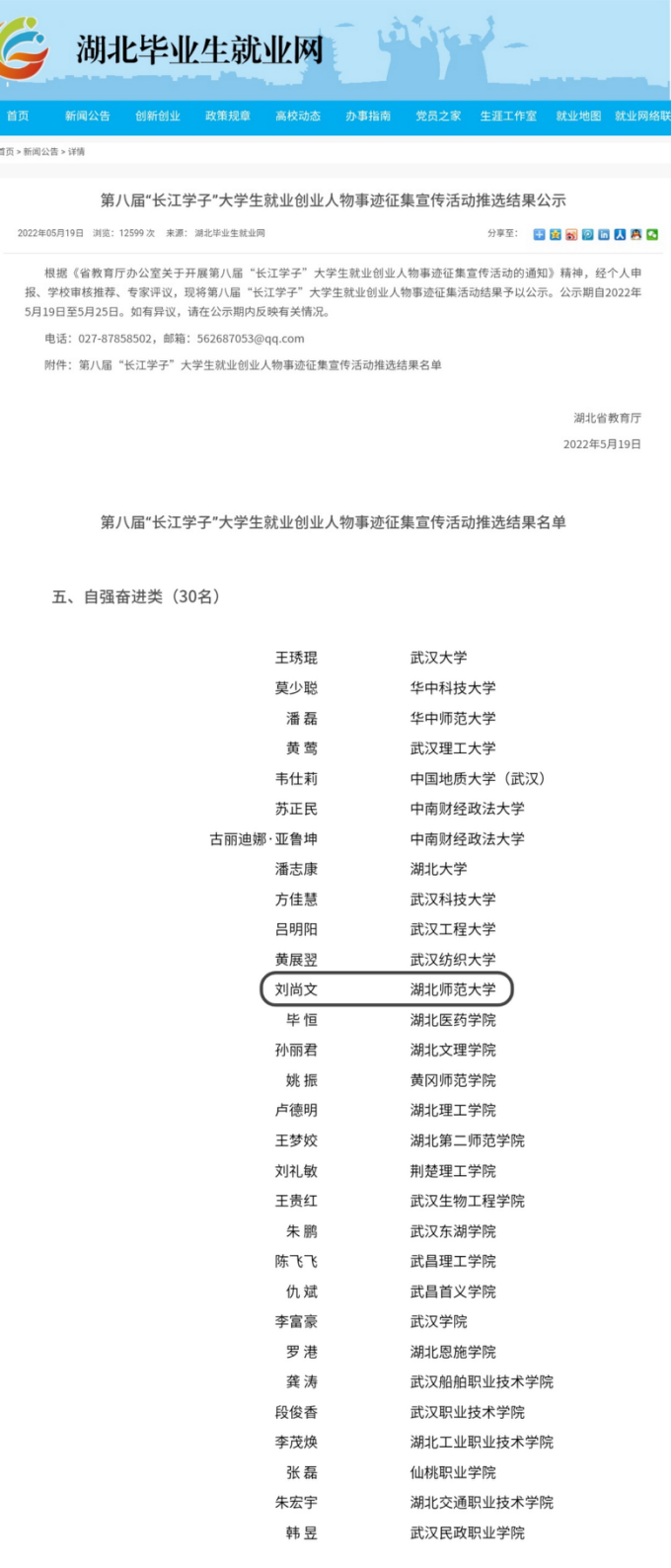 2022年5月19日,第八届“长江学子”大学生就业创业人物事迹征集宣传活动推选结果名单公布,我院学子刘尚文上榜本次活动自强奋进类名单。