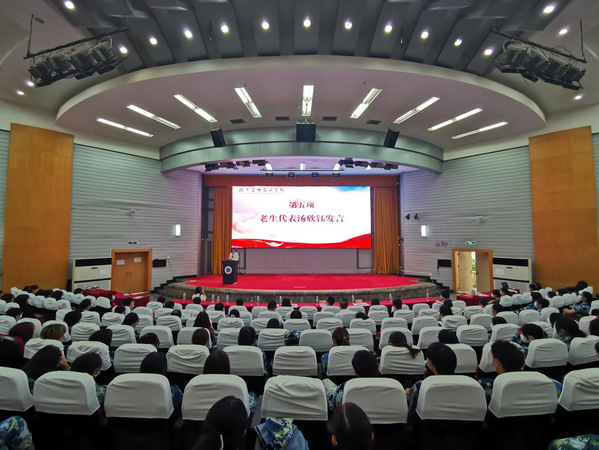 紧接着,2022级新生代表钟嘉雨同学上台发言,动情描述了她父亲援黄抗疫的感人经历,父辈以不凡的品质激励着她勇于奋斗,不懈努力。老生代表汤欣钰同学结合个人在校经历,寄语新生做好个人规划、把握机会,勇敢尝试。
