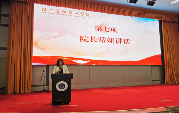 最后,常婕院长向同学们介绍了经管法学院的发展历史、师资力量、专业优势、教学平台等,并对同学们提出三点殷切希望:一是志存高远,勉励同学们要立大志,胸怀祖国;二是立德修身,希望同学们德才兼备,做品德高尚的大学生;三是乐学善思,告诫同学们勤奋学习,善于思考,掌握真正的本领。