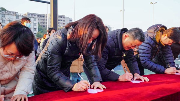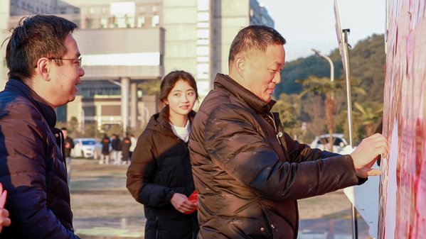 升旗仪式结束后,全体领导老师和学生代表手写祝福贺卡,在祝福墙上贴上迎接50周年校庆的美好祝愿,大家还纷纷在主题相框中拍照留念。