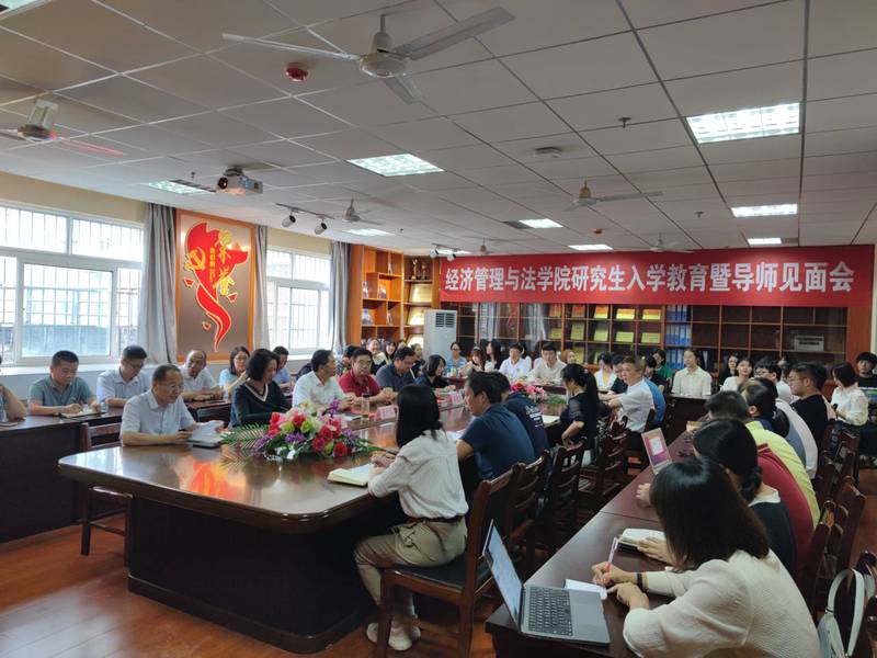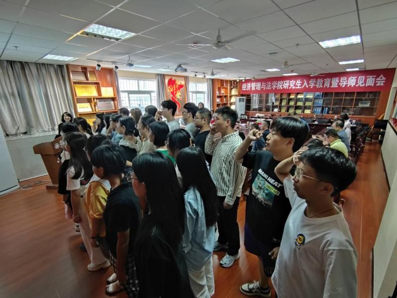 入学教育暨师生见面会首先由党委书记常婕致词,她从历史沿革、专业设置、教学科研平台等方面介绍了学院基本情况,并从加强导师交流、提升科研创新能力、积极参与学科竞赛和社会实践活动等方面提出期望要求;在新生代表发言环节,孙煜茗、栗佳佳分别进行发言,表达了对来学院深造学习的期待和奋发进取的决心。然后,导师代表黄本莲教授、张莉副教授发言对同学们提出了殷切的希望和嘱托,学科科研办主任夏晶开展了研究生培养管理制度宣讲。在副院长沈燕博士引领全体经管法23级硕士研究生进行入学宣誓后,校党委常委肖六亿教授从“问题、自信、改变、勤奋”四个关键词对研究生研究学习提出殷切希望,帮助研究生树立成功和收获的信心。