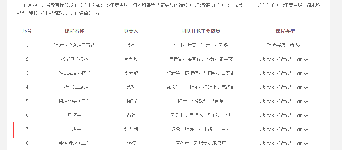 近日,省教育厅公布2023年度省级一流本科课程认定结果,我院两门课程入选其中黄梅老师教学团队(王小丹、叶菁、徐光木、刘耀庭)《社会调查原理与方法》获批省级社会实践一流课程,赵贤利老师教学团队(徐燕、叶亮军、王浩、王君安)主讲的《管理学》获批省级线上线下混合式一流课程。