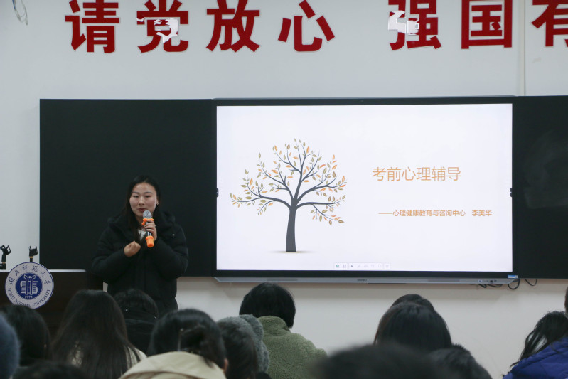 李美华为大家带来了一堂愉悦放松的考前压力疏解课,她结合心理学专业知识,引导大家正确认识焦虑,教会同学们科学调适压力的方法。现场同学们跟着舒缓音乐慢慢闭眼,渐渐入睡,褪去了所有的备考疲惫。