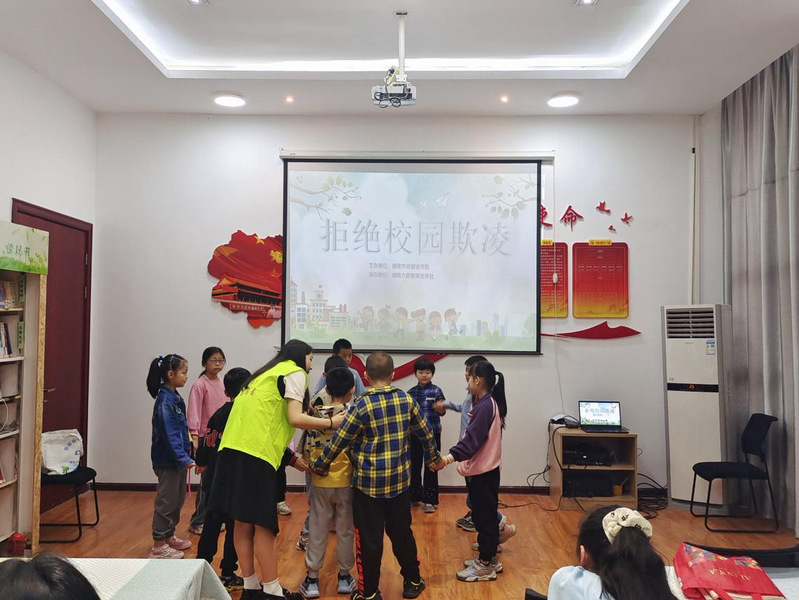 本次活动以桂花湾社区“周末课堂”为载体,共有一对一作业辅导和“反校园霸凌”主题普法活动两个环节。活动伊始,崔梦川老师带领志愿者们进入“周末课堂”,一对一指导同学们完成作业。在“反校园霸凌”主题普法活动环节,志愿者与孩子们展开了问答、小游戏等多个环节的互动,极大地调动了孩子们学习法律知识的积极性,增强了他们预防校园欺凌的意识。