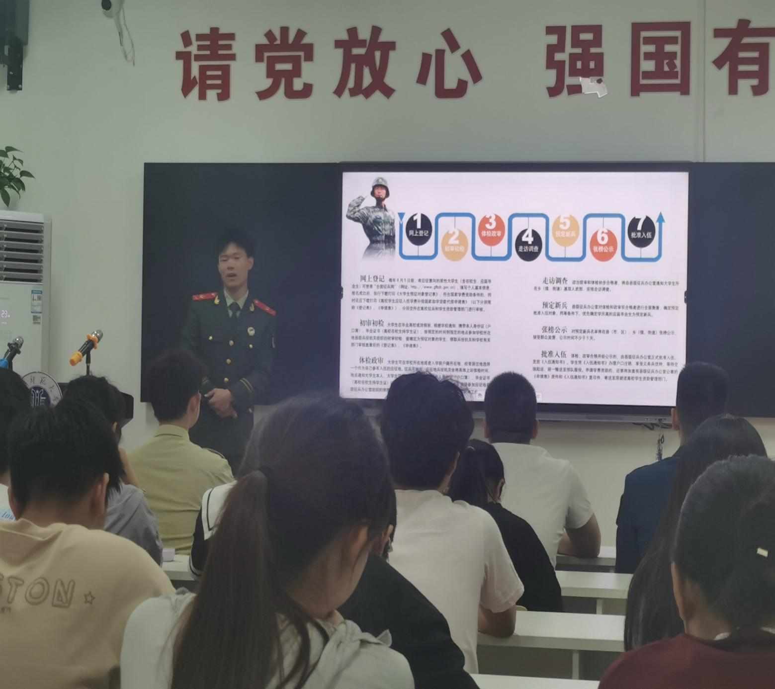 在集中观看了2024年全国征兵宣传片后,活动正式开始。三位优秀退役士兵包涵、张晨、张仕琛依次分享他们的军旅故事,向同学们介绍了征兵有关政策。他们把对军队热爱化成演讲的誓词,把自己青春的回忆化为眼中的光芒,令在场的同学为之动容,引发了大家对军旅生活的向往。宣讲结束后,现场遂及开展军事知识竞答,并为积极参与竞答的同学发放奖品,成功地将全场活动积极性带向高潮。最后,伟德国际1946源于英国辅导员王润作总结发言。王老师对参与此次征兵宣讲会的三位优秀退役士兵为国家和人民做出的贡献表示感谢,肯定了此次活动意义的同时也对活动中的不足提出建议,并在发言最后鼓励同学们多多了解国防知识,积极投身国防事业,踊跃报名参军入伍。
