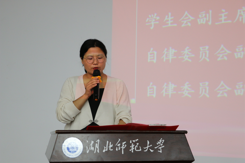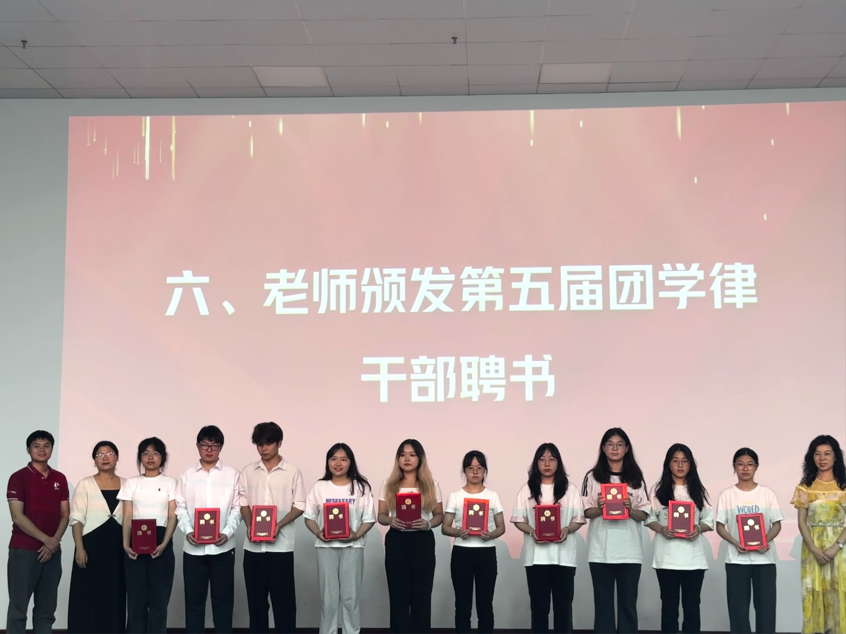 崔梦川老师宣读新任团总支、学生会和自律委员会学生常委及部长名单,并为学院第五届团学律干部颁发聘书。