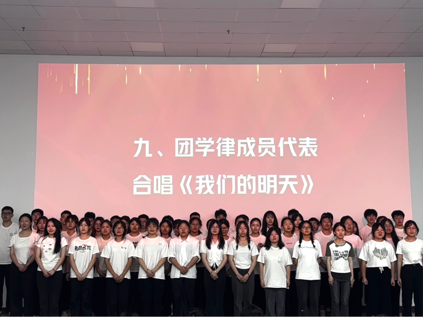 大会尾声,第五届学生干部们齐声合唱《我们的明天》,激昂的旋律唱出了团学律成员共同的心声, 经管法学院团学律全体成员,怀抱着对未来充满憧憬与期待,将携手共进,再创辉煌!