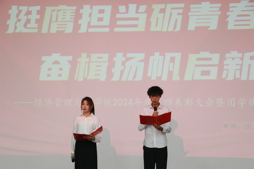 大会在庄严的国歌中拉开序幕。首先由徐科伟老师宣读了五四评优先进集体、先进个人的表彰名单,并为优秀团务工作者、学习标兵、社调活动先进个人、青年志愿服务之星、“菁”英学干、文体之星、创赛新星、优秀寝室长等获奖学生代表颁发荣誉证书。