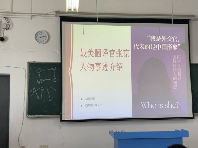 古丽加马丽.吾加卜杜拉同学宣讲的是最美翻译官张京的故事。在中美两国高层的战略对话会上,美方发难挑起争端,发言人高效精准的反击让人喝彩,整个发言长达16分钟。张京以沉稳大气、完整准确的表达,在这16分钟的翻译中驳斥了对方、并严正阐明了我方的立场。她用自己的能力展示了什么叫大国浸润之下的风范,向世界展示了女性独特的形象和力量。她知道自己想要什么,并在这条道路上坚定向前,为在迷茫着的女性树立榜样。不屑于外在,专注内心,不因声名而气躁,始终冷静沉着。