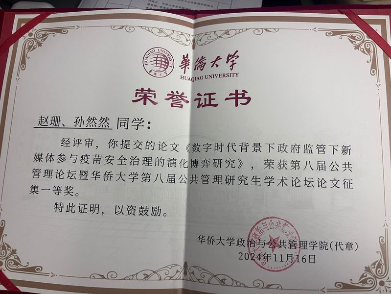 在下午举办的六个研究生分论坛中,我院赵珊同学汇报了题为《数字时代下疫苗安全治理:政府监管与新媒体参与的演化博弈》的专题报告。华侨大学政治与管理学院教授侯志阳对论文做出了高度的评价并给出了后续修改意见,为后续完善指明了方向,使汇报人受益匪浅。在最后的颁奖环节中,我院赵珊同学凭借其深入的研究和精彩的论文汇报,从众多参赛者中脱颖而出,荣获一等奖的好成绩。