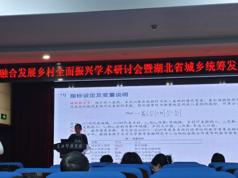 在下午举行的三个平行论坛中,来自全国各地的三十余名学者围绕城乡共同富裕、新质生产力、数字赋能和乡村振兴等城乡融合发展中的热点难点问题进行了深入交流。我院赵珊同学就《共同富裕背景下数字普惠金融对城乡收入差距影响的实证分析》这一主题进行了精彩汇报。她通过详实的数据和深入的分析,探讨了数字普惠金融在促进共同富裕、缩小城乡收入差距方面的积极作用,得到了湖北工业大学科学技术发展研究院副院长李平教授的好评,并提出了完善的建议,为汇报人后面修改指明了方向。