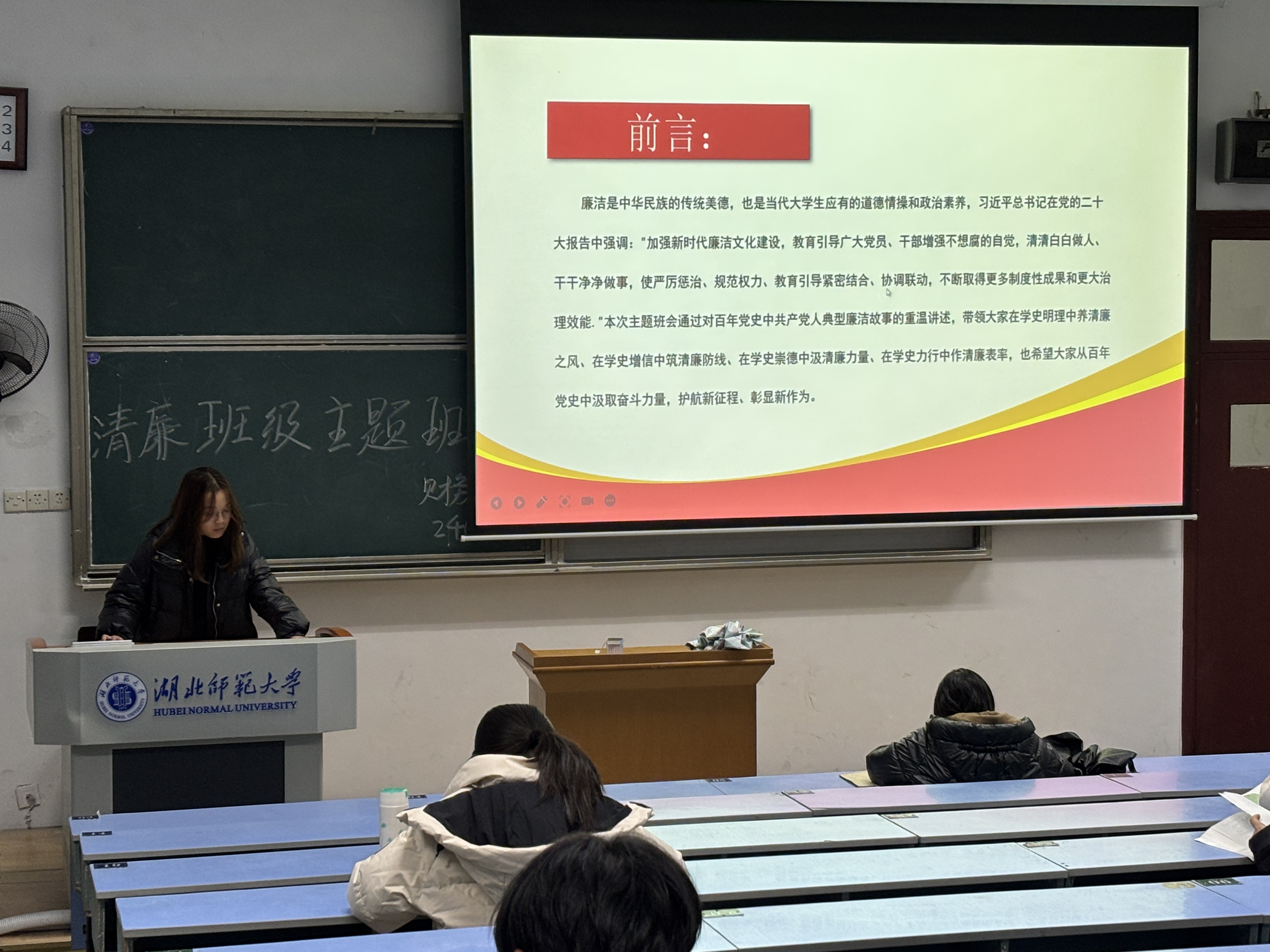 为推进清廉湖师建设,树立清廉风气,促进廉洁文化进校园、进班级,在学生头脑中根植“清正廉洁”的理念,12月15日-16日,经管法学院组织各班级开展“党史中的清廉故事”主题班会活动。