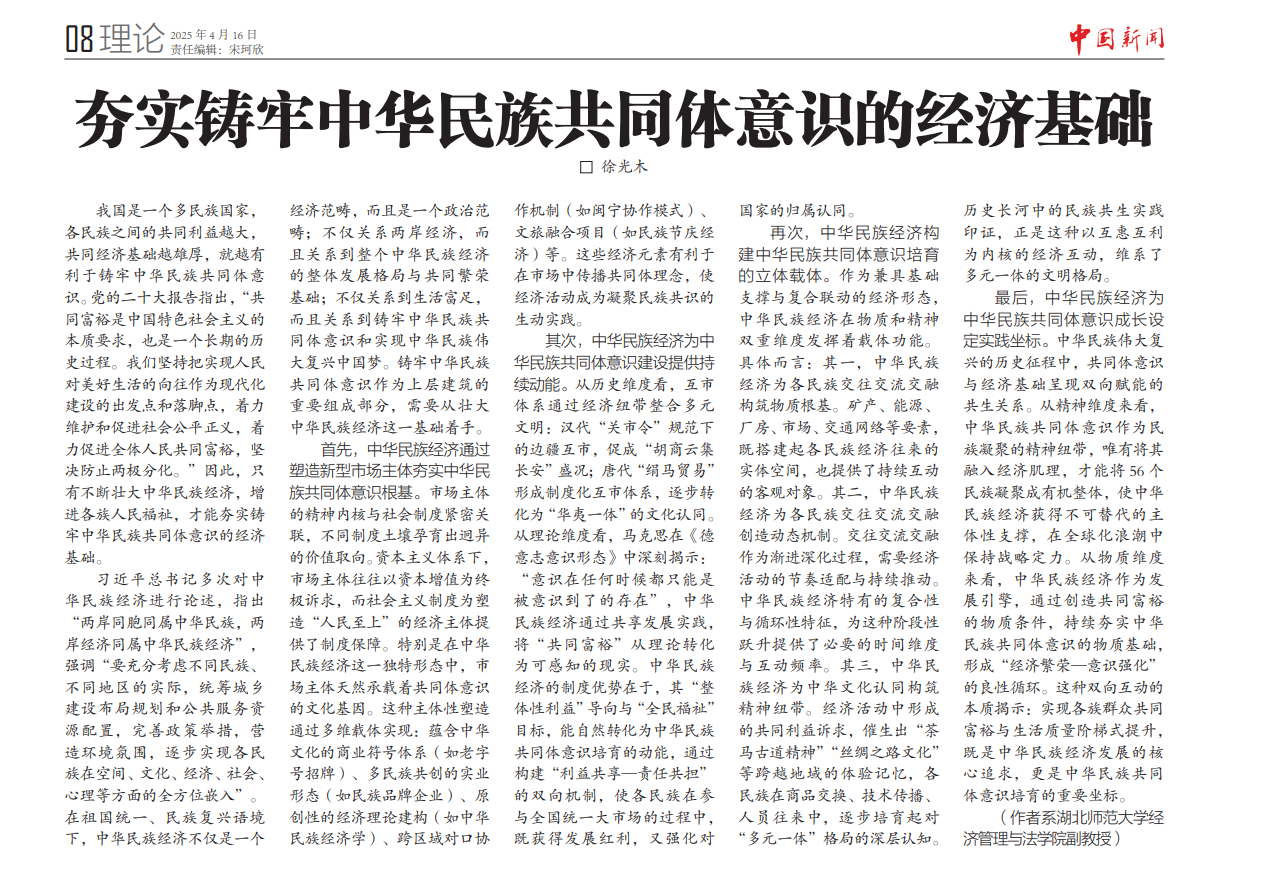 《中国新闻报》是中国新闻社主办的中央级报纸,致力于服务大统战工作格局,以开展统一战线领域新闻宣传和舆论引导工作为己任,是统一战线宣传工作的重要平台。近期,该报开设理论版,旨在发表高质量、有深度的学术文章,为统一战线理论与实践研究提供思想碰撞和学术交流的平台。徐光木博士长期在教育法学和统一战线学两个领域开展并行研究,该文是其主持的国家社科基金后期资助项目“铸牢中华民族共同体意识的经济基础及实践路径研究”(24FMZB009)的成果之一,对理解中华民族经济与铸牢中华民族共同体意识的关系具有理论意义。