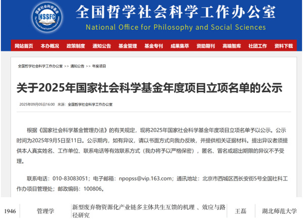 近日,全国哲学社会科学工作办公室发布《关于2025年国家社科基金年度项目立项名单的公示》。我院王磊博士申报的《新型废弃物资源化产业链多主体共生互馈的机理、效应和路径研究》进入2025年度国家社会科学基金青年项目公示名单。