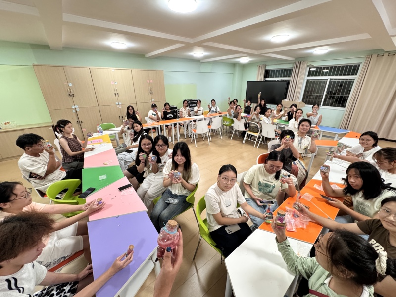 第三场活动是“沙瓶画”,同学们层层铺洒彩沙,通过色彩渐变与构图设计,在瓶中构筑独特的小世界,沙粒流动的韵律与创作时的专注,让忙碌的思绪悄然沉淀。