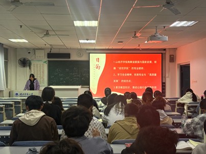 为深入学习贯彻党的二十届四中全会精神,落实“立报国强国大志向,做挺膺担当奋斗者”宣传教育要求,引导青年学子将个人成长融入国家发展大局,11月以来,经管法学院组织全院班级集中开展“我与中国式现代化”主题班会,通过理论学习、视频观看、互动研讨等形式,推动全会精神入脑入心,激发学生挺膺担当的青春自觉。