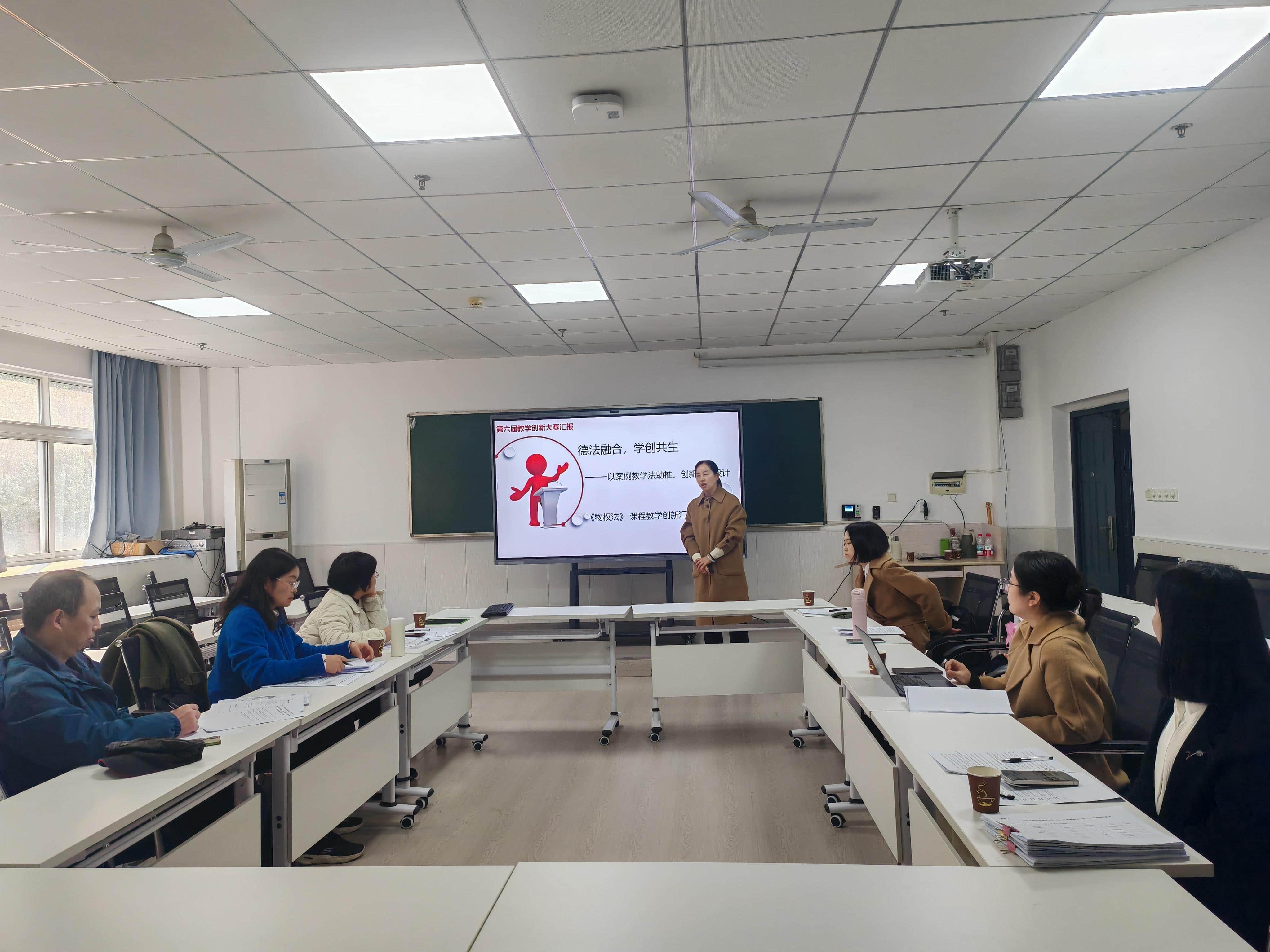 冯灵、叶菁、徐玺和赵贤利四位参赛教师按照抽签顺序依次汇进行,围绕课程教学目标、创新教学设计、教学实施过程及教学成效等方面展开精彩汇报。他们结合各自授课课程的特点,生动展示了在教学理念创新、教学方法改革、人工智能应用等方面的创新探索。赵贤利老师以管理学课堂教学痛点为抓手,提出了“思政引领、AI驱动、五融五塑”课程思政创新教学模式;叶菁老师则聚焦“物权法”课程案例教学,以德法融合,学创共生为理念,分享了如何将法律条文与社会主义核心价值观相结合,在案例教学中潜移默化地培养学生的法治精神和责任意识。汇报过程中,教师们思路清晰、表达流畅,充分展现了我院教师积极投身教学创新的热情与专业素养。