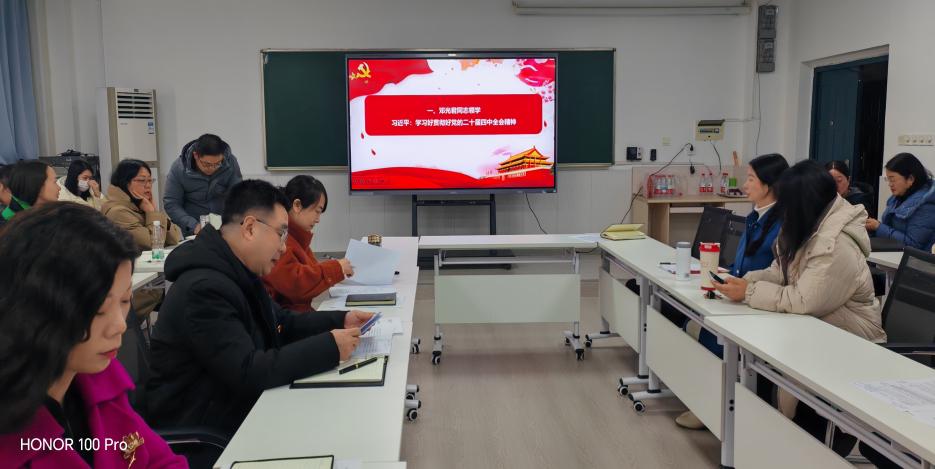会上,在完成交纳党费、重温入党誓词和集体诵读党章等规定动作后,支部为一月份入党的高乐同志过政治生日。在集中学习环节邓光君、沈燕、侯彩云、王小丹、赵贤利等同志分别领学了《学习好贯彻好党的二十届四中全会精神》的说明、《中共中央关于制定国民经济和社会发展第十五个五年规划的建议》诞生记、中共黄石市委十四届九次全体会议、黄石市纪委监委通报6起违反中央八项规定精神问题典型案例、省纪委监委通报5起党员干部醉驾典型问题等重要文献及党纪学习教育材料。随后,杨冰楠、田卓亚同志结合教师党员身份,围绕如何主动作为,提升政治站位,将学习成果转化作为推动工作的基本思路和务实举措,为“十五五”良好开局贡献应有力量进行了交流。